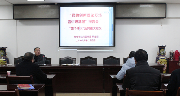 为引导广大党员深化学习习近平新时代中国特色社会主义思想,扎实推动党的创新理论成果深入人心,把党的十九大精神落到实处,12月4日,申博SUNBET在理科楼511会议室举行“党的创新理论万场宣讲进基层”专题报告会,公司党委书记柳士刚为公司全体师生党员作了题目为《“四个伟大”及其重大意义》的专题报告。
