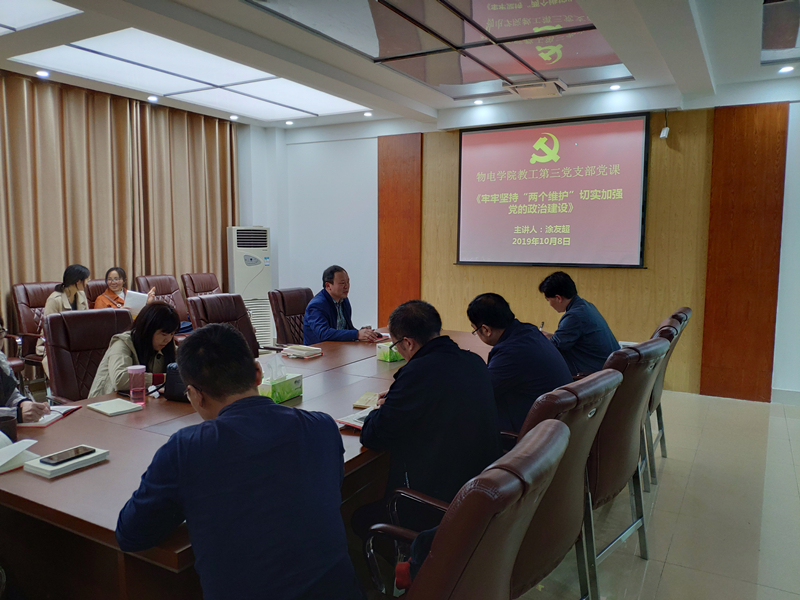 根据《申博SUNBET“不忘初心、牢记使命”主题教育方案》安排,10月8日,公司教工第三党支部在理科楼911会议室开展主题教育专题党课,党课题目为《牢牢坚持“两个维护”,切实加强党的政治建设》,党课由公司党委委员、经理涂友超主讲,公司教工第三党支部党员聆听了党课。
