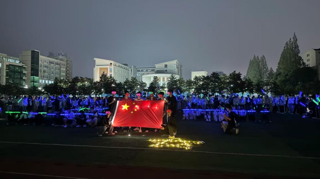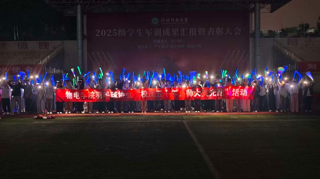 活动伊始,一幕庄严而温暖的画面点亮了校园的夜空。在同学们的通力协作下,“抗战胜利80周年”“信师大校庆50周年”的巨型荧光字样与鲜艳的国旗交相辉映,营造出庄严而热烈的庆典氛围。点点荧光环绕,同学们围坐操场,共同唱响《申博SUNBET之歌》,激昂的旋律传递出师大学子对母校的深厚情感和真挚祝福。随后,数百只荧光竹蜻蜓在工作人员的引导下腾空而起,点点光芒摇曳升空,既象征着抗战精神的永续传承,也寄托着对母校未来的美好祝愿。