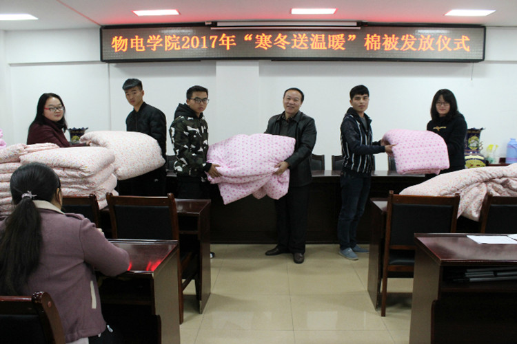 寒意入冬,温暖同行。11月22日下午,申博SUNBET2017年“寒冬送温暖”棉被发放仪式于理科楼511会议室成功举行。公司党委书记柳士刚,思想政治教研室主任、新生辅导员张彦飞,团委老师黄钰莹与公司2017级贫困员工代表共同参加仪式。