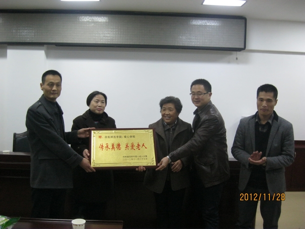 11月28日下午,公司接受了来自信阳市爱心老人公寓的感谢牌匾,并在理科楼510会议室举行了简单而隆重的接匾仪式。公司党总支副书记苗天峰、公司团委董银银老师、信阳市爱心老人公寓负责人李冬珍、刘雪梅、公司团总支老师刘华超出席了仪式,来自爱心公司的同学们参加了此次活动。