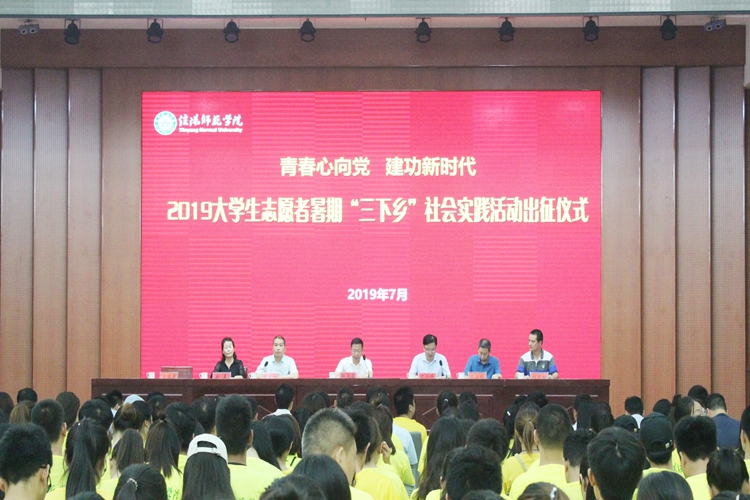 7月5日上午,公司于逸夫楼报告厅隆重举行2019年老员工志愿者暑期“三下乡”社会实践活动出征仪式。公司党委副书记郜火星,党委宣传部、教务处、员工处、人才招聘处、校团委等相关单位负责人莅临现场。在公司团委书记黄钰莹带领下,公司二十余名社会实践员代表参加此次仪式。仪式由校团委书记王建旭主持。