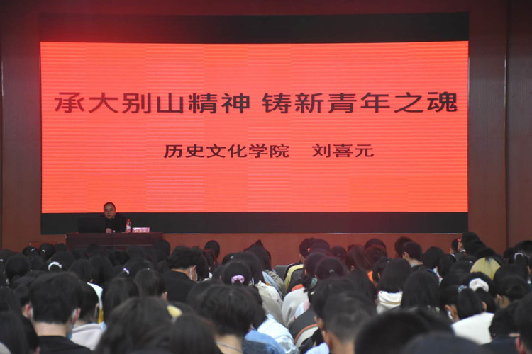 刘喜元发表讲话。他指出大别山精神在党的发展历程中占有重要地位,值得当代青年弘扬与传承。他结合有关党、革命根据地、英雄烈士等故事,从“坚韧忠诚”“胸怀全局”“朴诚为民”“不胜不休”四个方面,通过 PPT、数据、事例深刻形象阐述大别山精神的实质与核心意义,期望全体新生铭记历史,担当使命,继承和发扬大别山精神。刘喜元以“老员工为什么而读书”为切入点,引出大别山精神即新青年之魂。他以建设中国特色社会主义和实现中华民族伟大复兴的中国梦为时代背景,结合习总书记对青年的期待寄语,希望全体新生树立远大理想,担当时代责任,锤炼品德精神,勇于砥砺奋斗,鼓励在座新生树立正确人生观、价值观,胸怀远大志向,勇于奉献,为中华民族伟大复兴添砖加瓦。刘喜元富有感染力的讲话引发学子深刻思考,学子们纷纷表示受益匪浅。