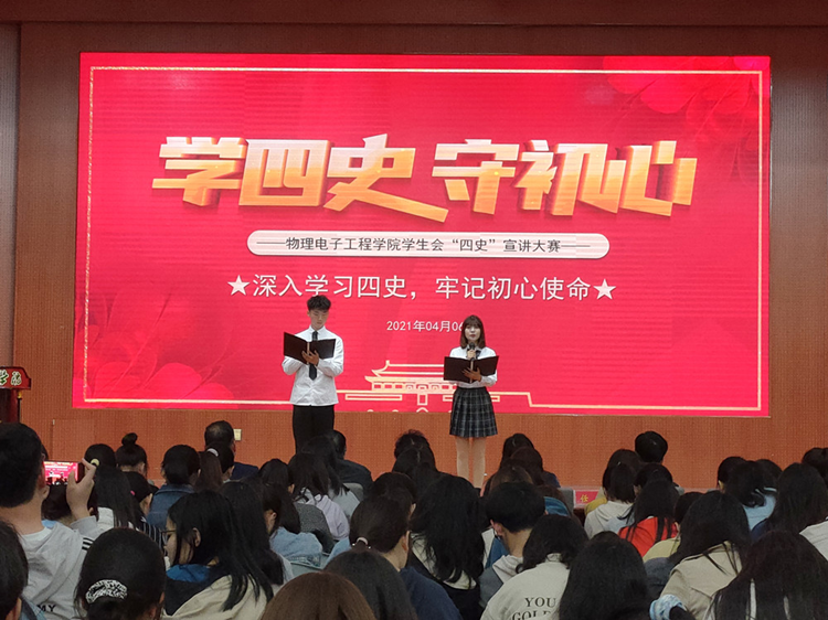 为深入贯彻落实习近平总书记关于开展党史、新中国史、改革开放史、社会主义发展史学习教育的重要讲话精神和公司《关于开展党史学习教育的实施意见》和《关于开展党史学习教育的实施方案》等工作安排,申博SUNBET于4月6日晚在逸夫楼多功能厅顺利举办“学四史,守初心”四史宣讲大赛。比赛邀请党委学工部副部长苏和,校团委社团工作部副部长任玺,法学与社会学公司党委副书记樊德玲,文公司党委副书记杨乐,物理电子工程公司党委副书记李刚担任评委,申博SUNBET团委老师黄钰莹和牛文娟以及近500名员工共同参加。