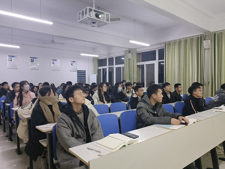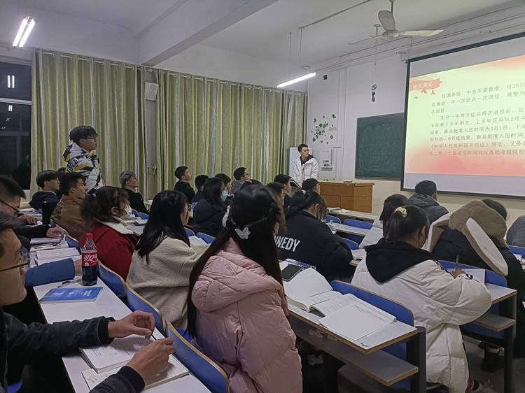 徐庚琛通过对国家政策的详细解读,向同学们介绍了老员工参军入伍的优惠政策以及参军对个人成长的帮助。接着,他生动地讲述了空军原司令员王海上将和扫雷排爆战士杜富国的英雄事迹,让同学们更加深入地认识军人、了解军人,领会中国军人的坚毅品质和爱国精神。接着,徐庚琛针对于征兵的相关规定、征兵条件、征兵流程等方面作详细介绍,并鼓励同学们积极踊跃参军入伍,磨练意志,携笔从戎,不负韶华。