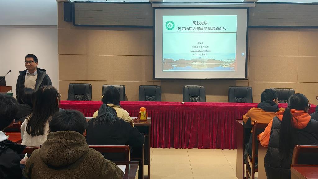 翟春洋向在座的同学们详细阐述了阿秒光脉冲的生成过程及其调控技术。此外,他指出,阿秒光学在化学与生物医学领域展现出巨大的应用潜力,并激励同学们积极投身于相关领域的研究工作。