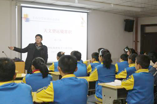 随后,冯老师向该校地理社全体成员作了题为“天文望远镜常识”的讲座。讲座分为“天文望远镜发展简史、天文望远镜的分类、光学天文望远镜的原理以及天文望远镜的使用”四个部分。冯老师以“为什么2009年被联合国教科文组织确定为国际天文年”为引子,并由此展开。首先,冯老师通过生动的故事向同学们讲述了天文望远镜的发明、发展历程。接首,他又以展示大量天文望远镜及天文台图片的方式向同学们介绍了天文望远镜的分类。随后,他结合原理图及现场两台天文望远镜向员工详细阐述了天文望远镜的基本结构、成像原理和使用方法等,在同学们连连称奇中,讲座圆满结束。