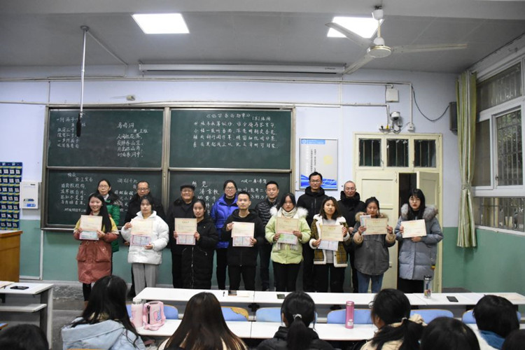 随后,公司于教二梯一教室进行了获奖选手粉笔字展示和颁奖。在粉笔字展示环节中,一、二等奖获得者顺序上台在黑板上书写随机抽取的诗歌内容,学子们全神贯注、精心排版、行云流水、一气呵成,凭借端庄娟秀、整齐大方的字体向在场观众展现了中华汉字的独特魅力,赢得评委和观众的一致好评。最后,大赛评委老师为获奖人员颁发证书、奖品并合影留念。