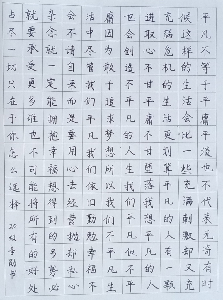 本次活动自11月初启动以来,以“笔尖风华肆意绽放”为主题,主要分为粉笔、钢笔、毛笔三项比赛,包含投稿、初评、复评、颁奖等四个环节,以2018级物理学专业员工为主要参赛对象,其他年级和专业员工自愿参加。公司以宿舍为单位为师范生免费配备了小黑板、字帖、练字纸、墨汁、毛笔、粉笔等材料,以赛带练,推动全院员工自主进行“三笔字”书写训练,引导员工把写好汉字、每天练字作为一种日常化的行为。