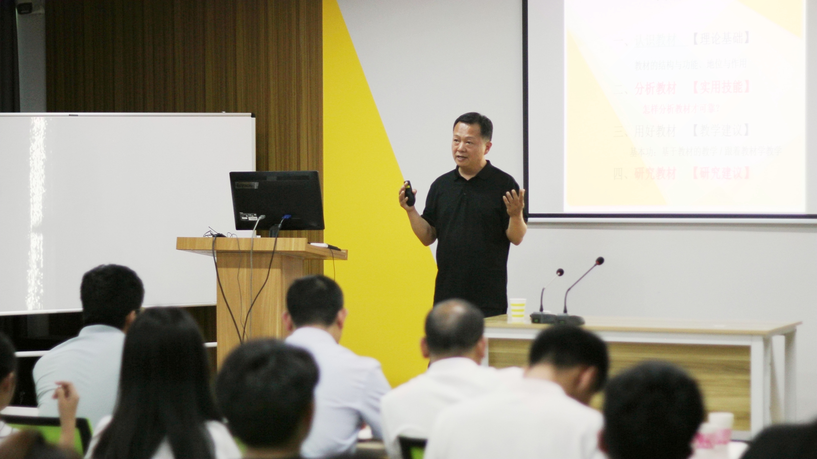 报告会上,陈运保深入分析了教材的结构与功能、地位与作用,系统地阐述了教材分析的转化与重要意义。在如何进行教材分析方面,报告从教材分析评价工具出发,探讨了如何基于教材来有效表征科学概念,并提出了概念形成的策略。最后,以物理中的“摩擦力”和“相互作用”为例,阐明了教材分析在备课与教学中的具体实施方法,指出基于证据的教材分析策略不仅为教学实践提出了有效突破口,也为教学评价与反思带来新的视角。在交流环节,老师员工们积极交流讨论,陈运保教授结合多年的理论和实践研究逐一进行了解答。